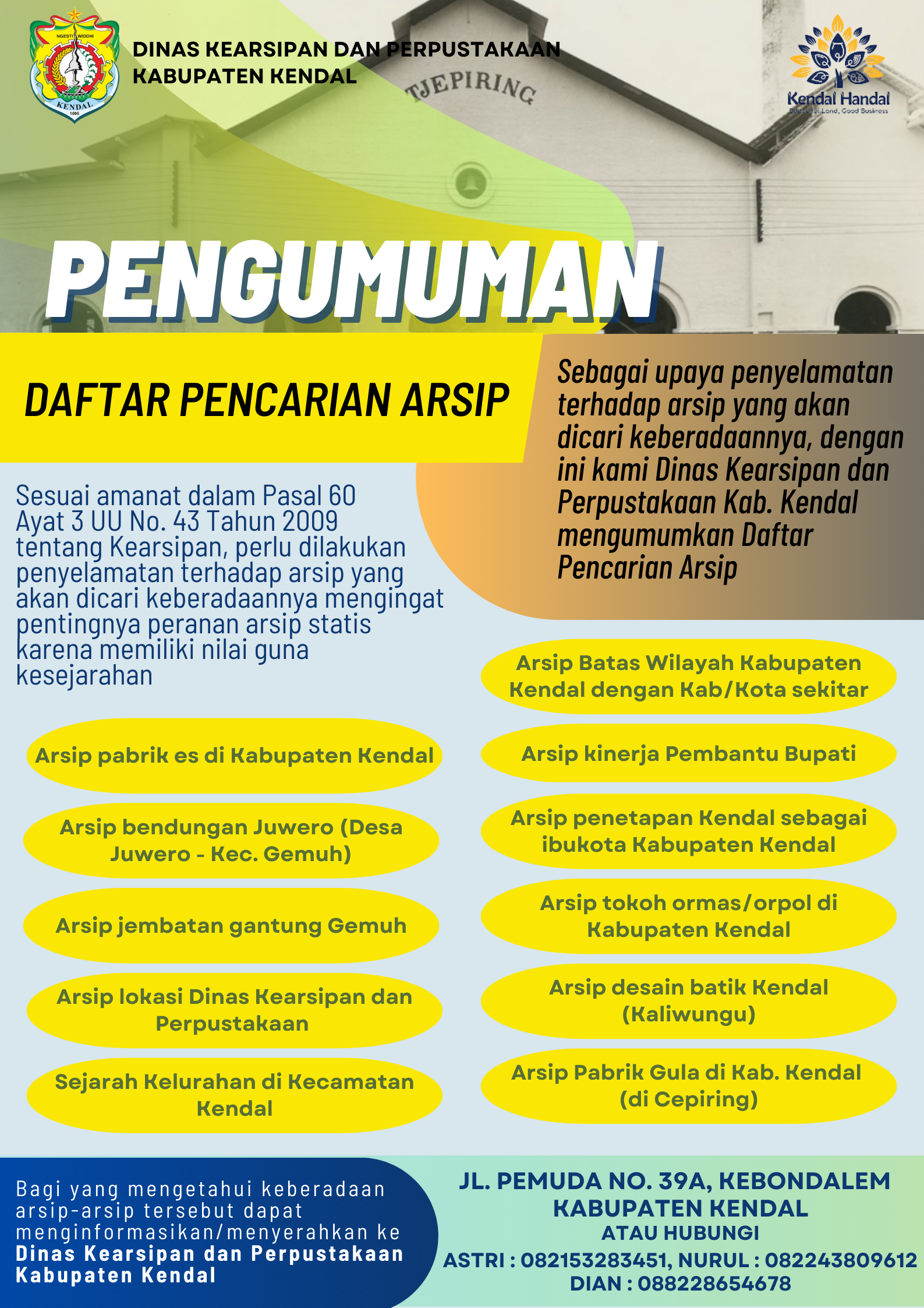 Sebagai upaya penyelamatan terhadap arsip yang akan dicari keberadaannya, dengan ini Kami Dinas Kearsipan dan Perpustakaan Kabupaten Kendal mengumumkan daftar pencarian arsip.
